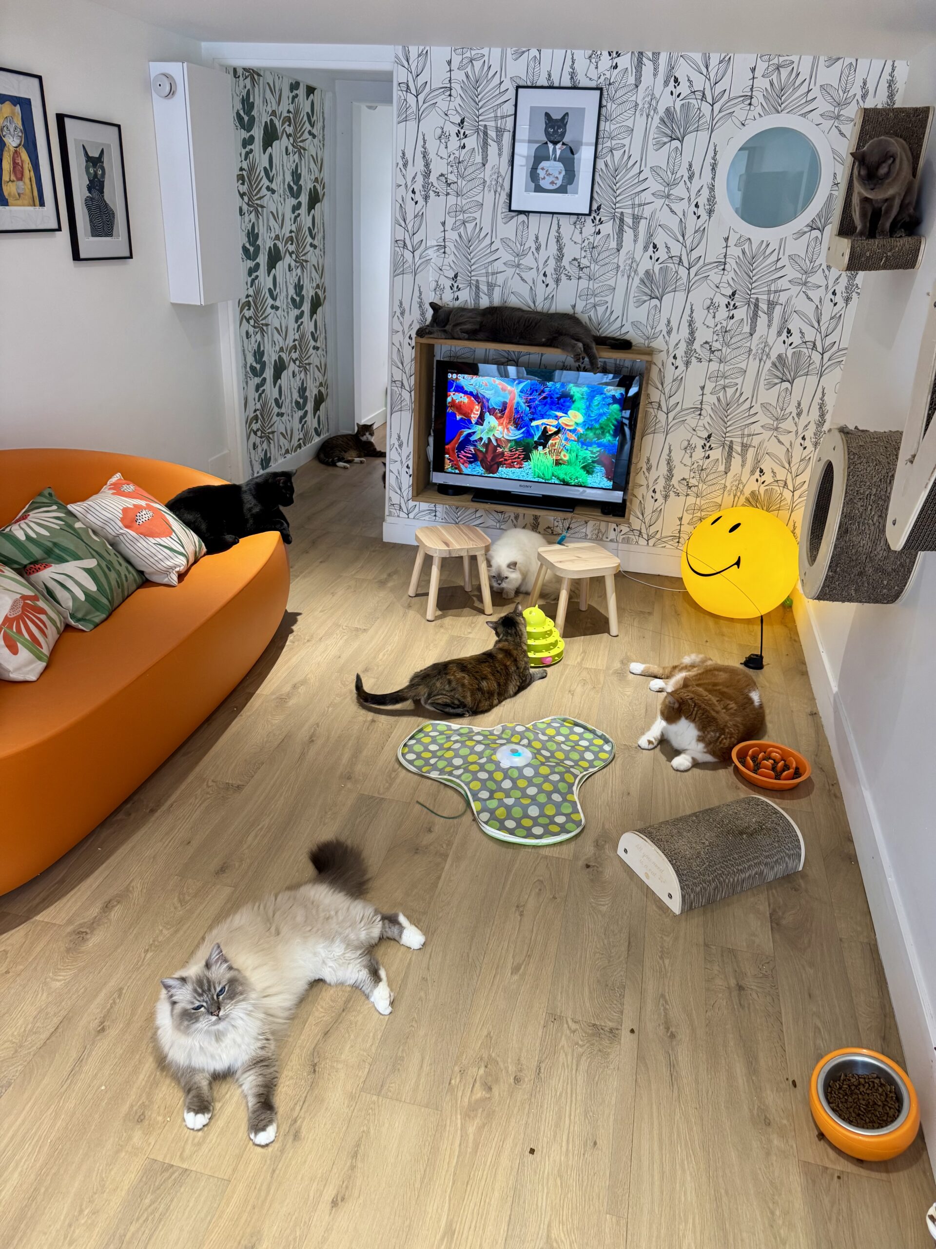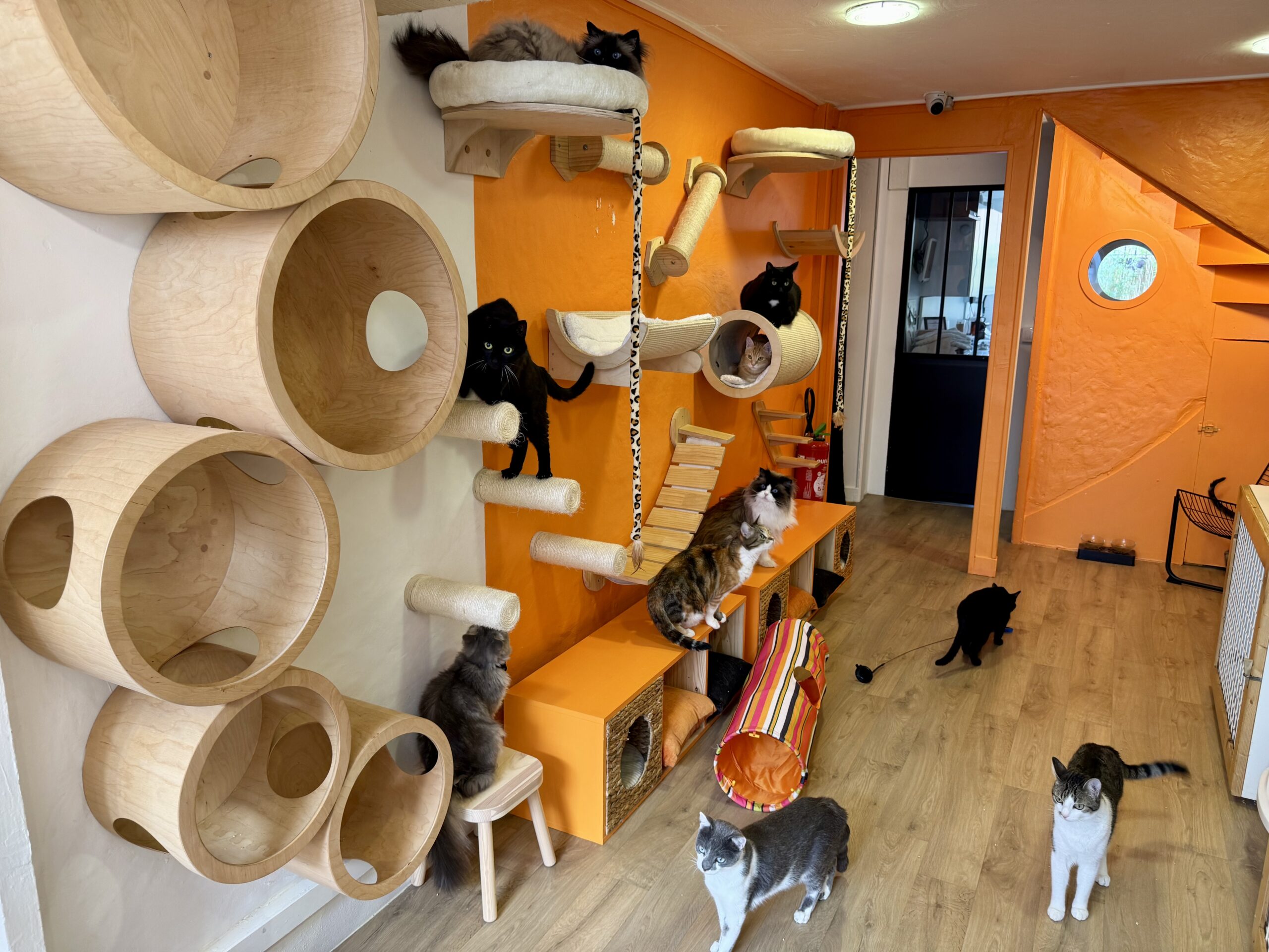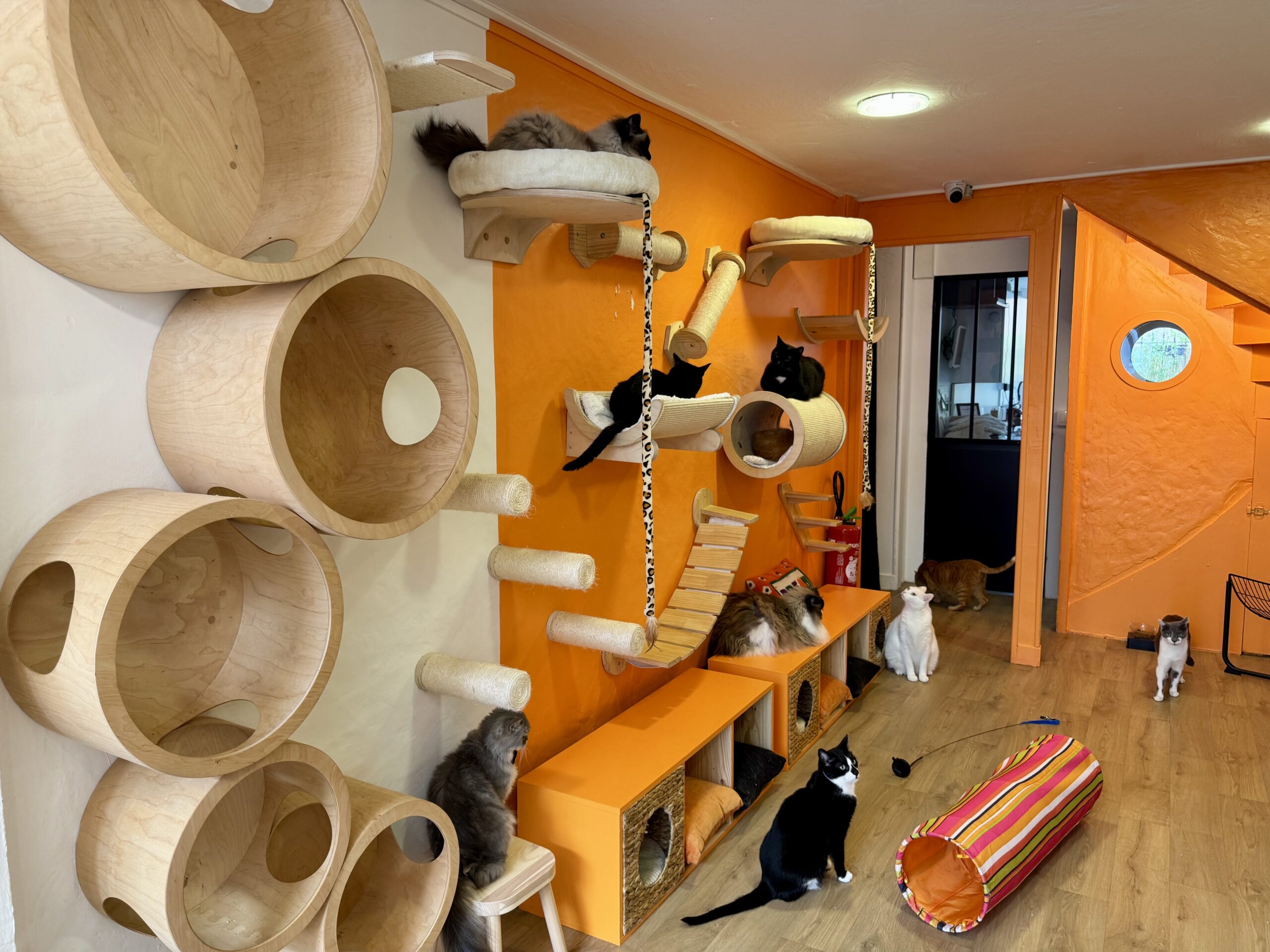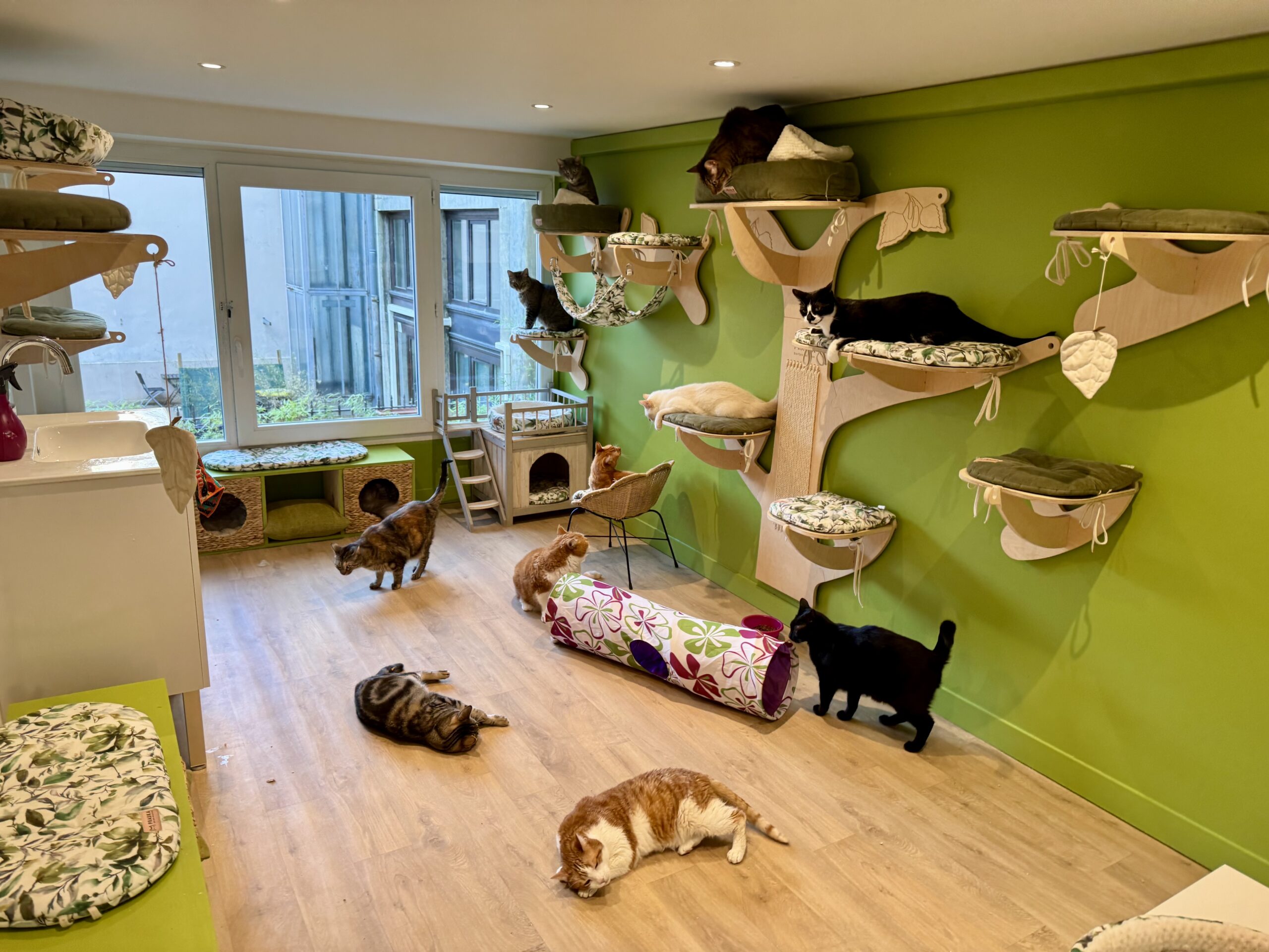 Découvrez des espaces à thème, un salon TV, une zen room cosy et de fabuleux arbres a chats dans chaque espace avec des vues extérieures. Un véritable écrin pour vos sens
